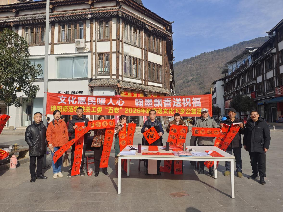 为深入学习贯彻党的二十大精神,弘扬中华优秀传统文化,丰富基层群众精神文化生活,2026年1月16日校关工委组织“五老”王家松、吴谦赴平武县江油关镇开展新春送文化下乡公益活动。